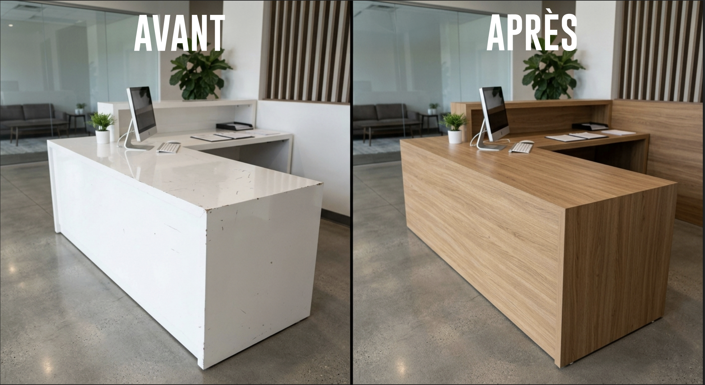Idéal pour vos bureaux, notre solution de covering adhésif transforme vos espaces en apportant modernité et fonctionnalité à votre mobilier.